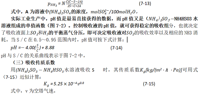 在通入氨量較少時(shí),發(fā)生式(7-1)反應(yīng),在通入氨量較多時(shí)發(fā)生式(7-2)反應(yīng),而式(7-3)表示的才是氨法中真正的吸收反應(yīng)。在吸收過程中所生成的酸式鹽NH4HSO3對(duì)SO2不具有吸收能力,隨吸收過程的進(jìn)行,吸收液中的NH4HSO。數(shù)量增多,吸收液吸收能力下降,此時(shí)需向吸收液中補(bǔ)充氨,使部分NH4HSO3轉(zhuǎn)變?yōu)?NH4)2SO3,以保持吸收液的吸收能力。